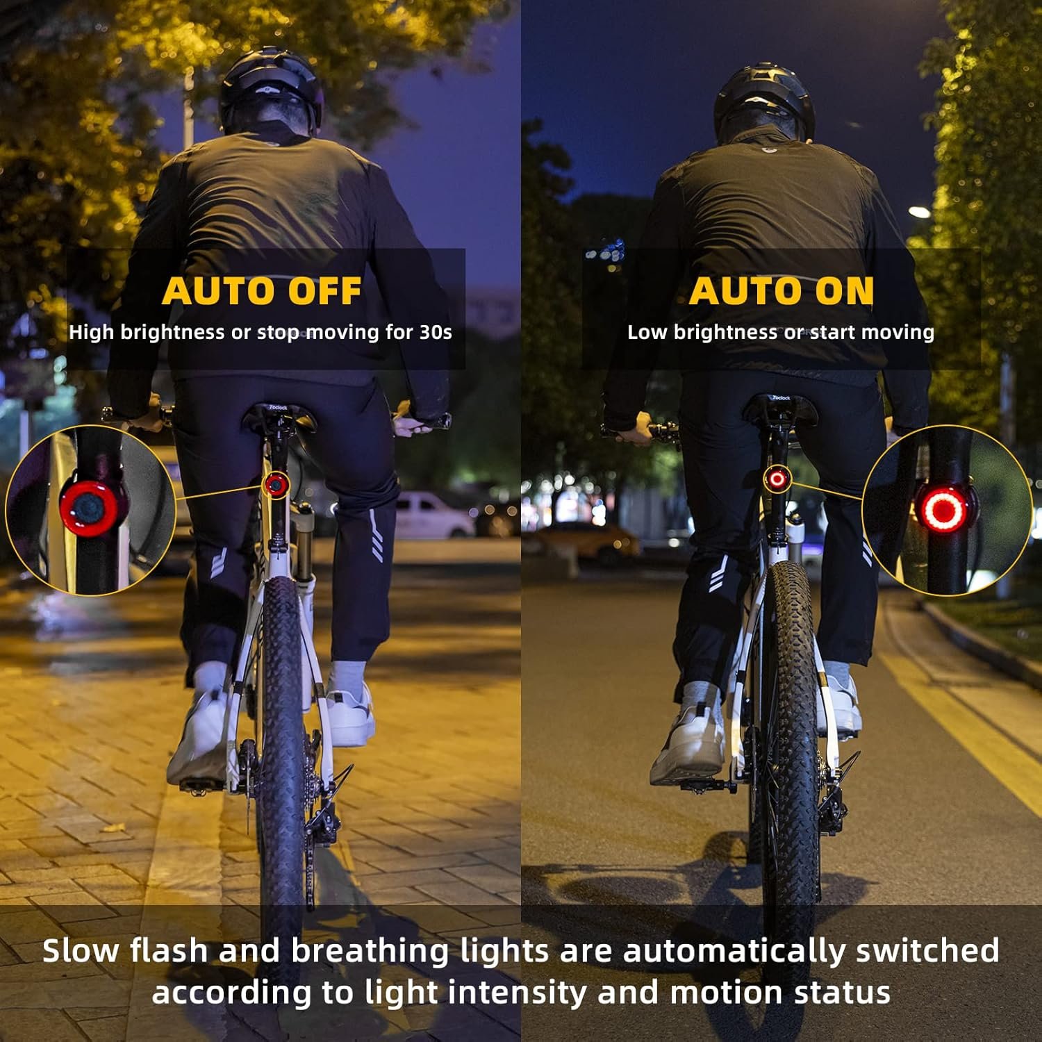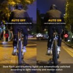 4 LIGHT MODES & SAFETY – ROCKBROS bike rear light has 4 different lights to switch: Flashing Mode, Breathing (Gradient Pulse) Mode, Strobe Mode, and Steady On Mode. When riding suddenly brakes or decelerates, the tail light will automatically switch to high-brightness mode to ensure safe riding and remind people behind