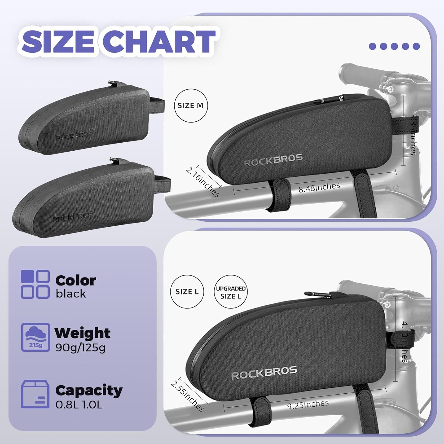 LARGE CAPACITY: The bike frame bag is big enough to store your wallet, energy gel, inner tube, mobile phone, gloves, repair bike tool, power bank and so on. Size L: 9.25 * 4.13 * 2.55inches, Size M: 8.48 * 3.35 *2.16inches