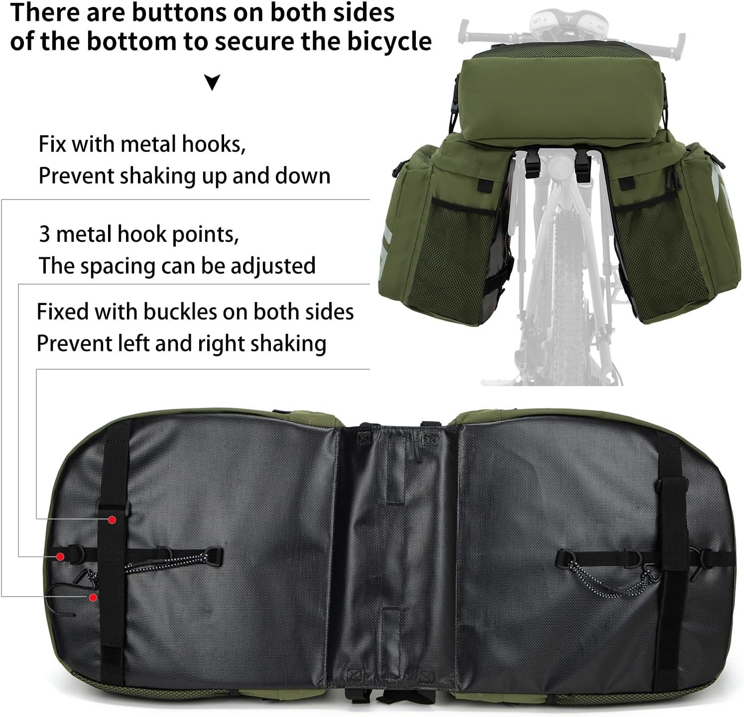 Strong Fixation: The bicycle rack bag has 4 strong straps and 2 strong Velcro. It also comes with 2 side hooks to perfectly fix it to the rack; there are also 2 straps to fix additional backpacks or items