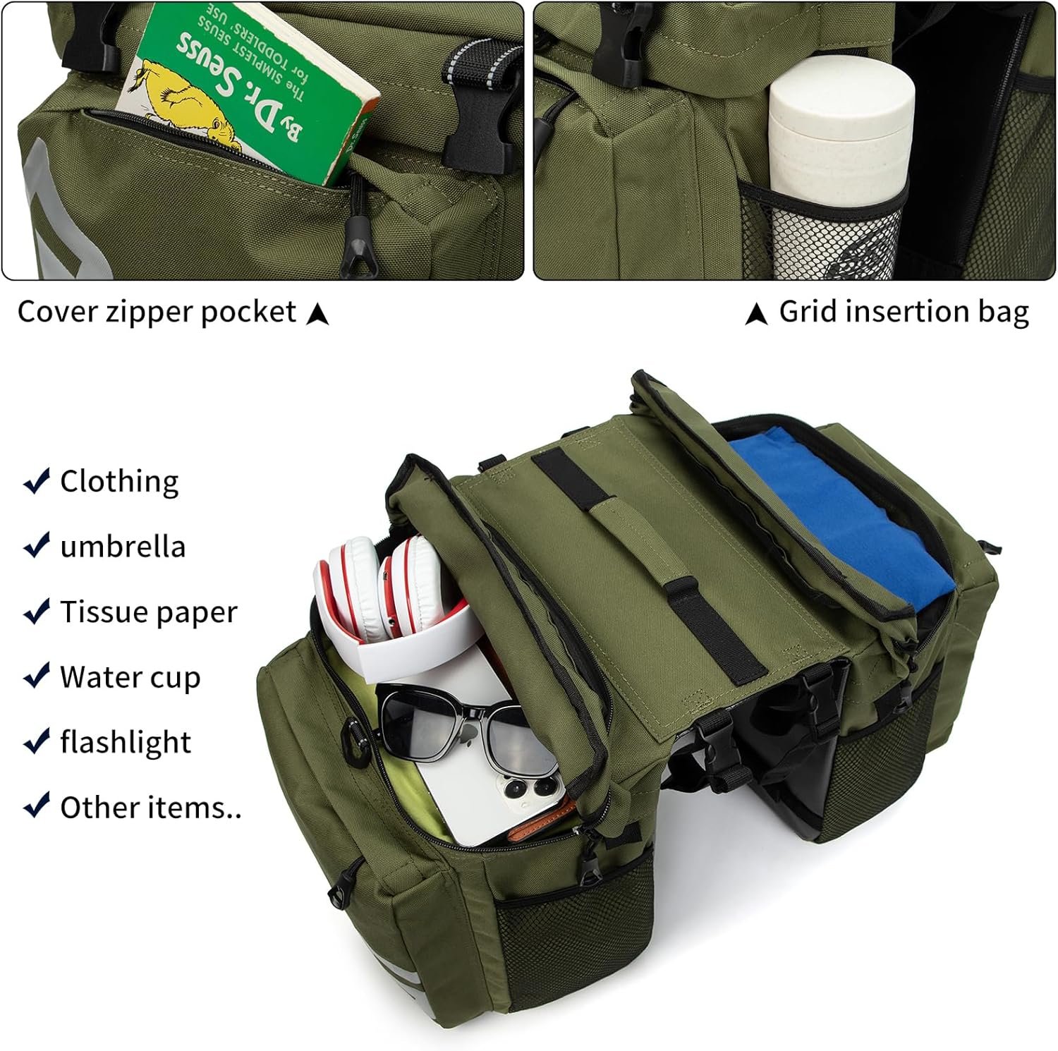 4. Large volume capacity up to 37L (10 gallons). Top bag with a big mesh pocket can hold a 17 inches laptop. Each side bag has a big pocket and as small mesh pocket. It has enough room to carry cycling accessories cycling tools, every day grocery and camping gears.