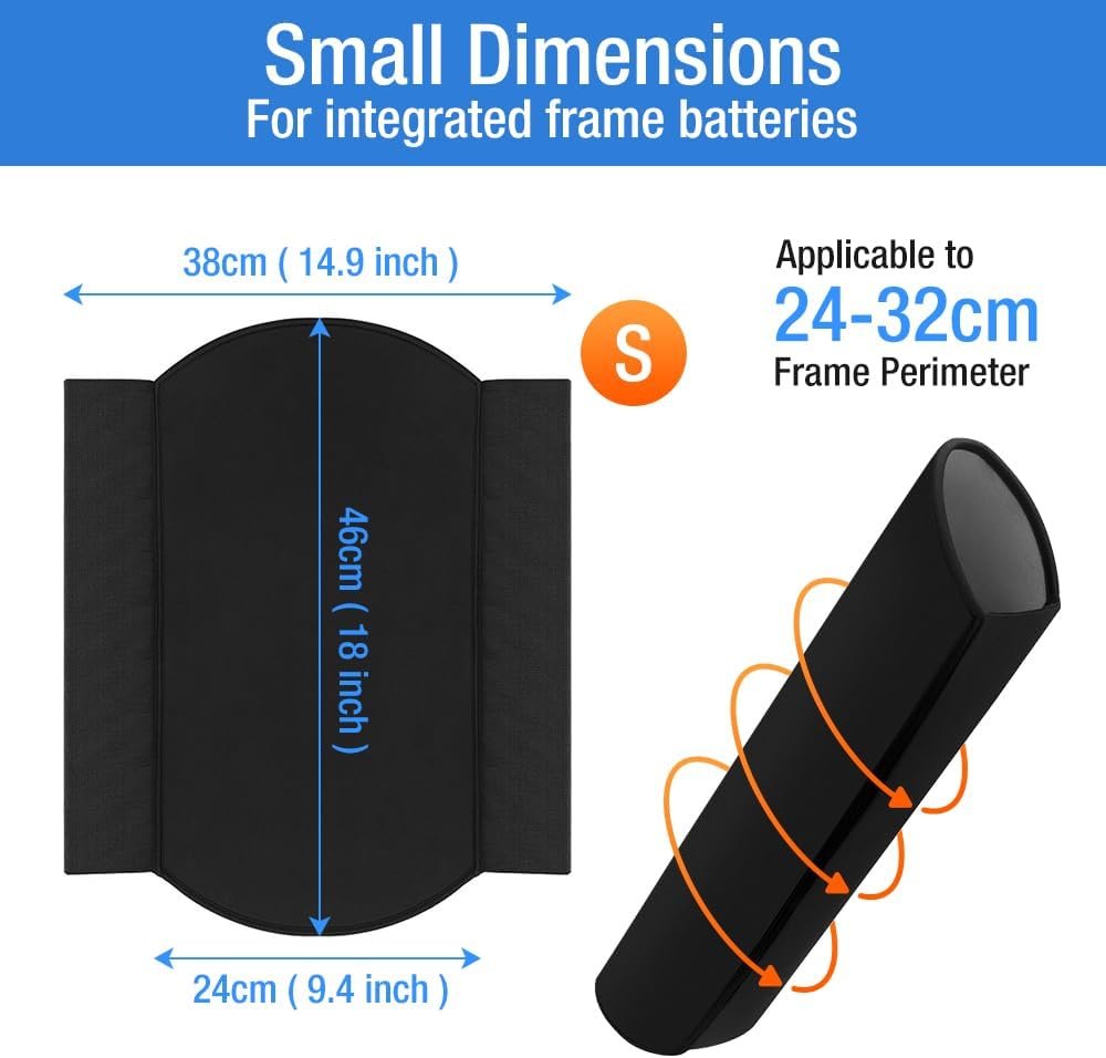 【Perfect Design】In order to better protect frame batteries of different sizes, we offer 3 size options. Size: S/M/L. S (46*38cm/18*14.9in, fits frames with a circumference of 24-32cm); M (50*42cm/19.6*16.5in, fits frames with a circumference of 28-36cm, suitable for most popular brand frame batteries); L (50*50cm/19.6*19.6in, fits frames with a circumference of 36-45cm).You can choose the appropriate size to purchase according to your own needs.