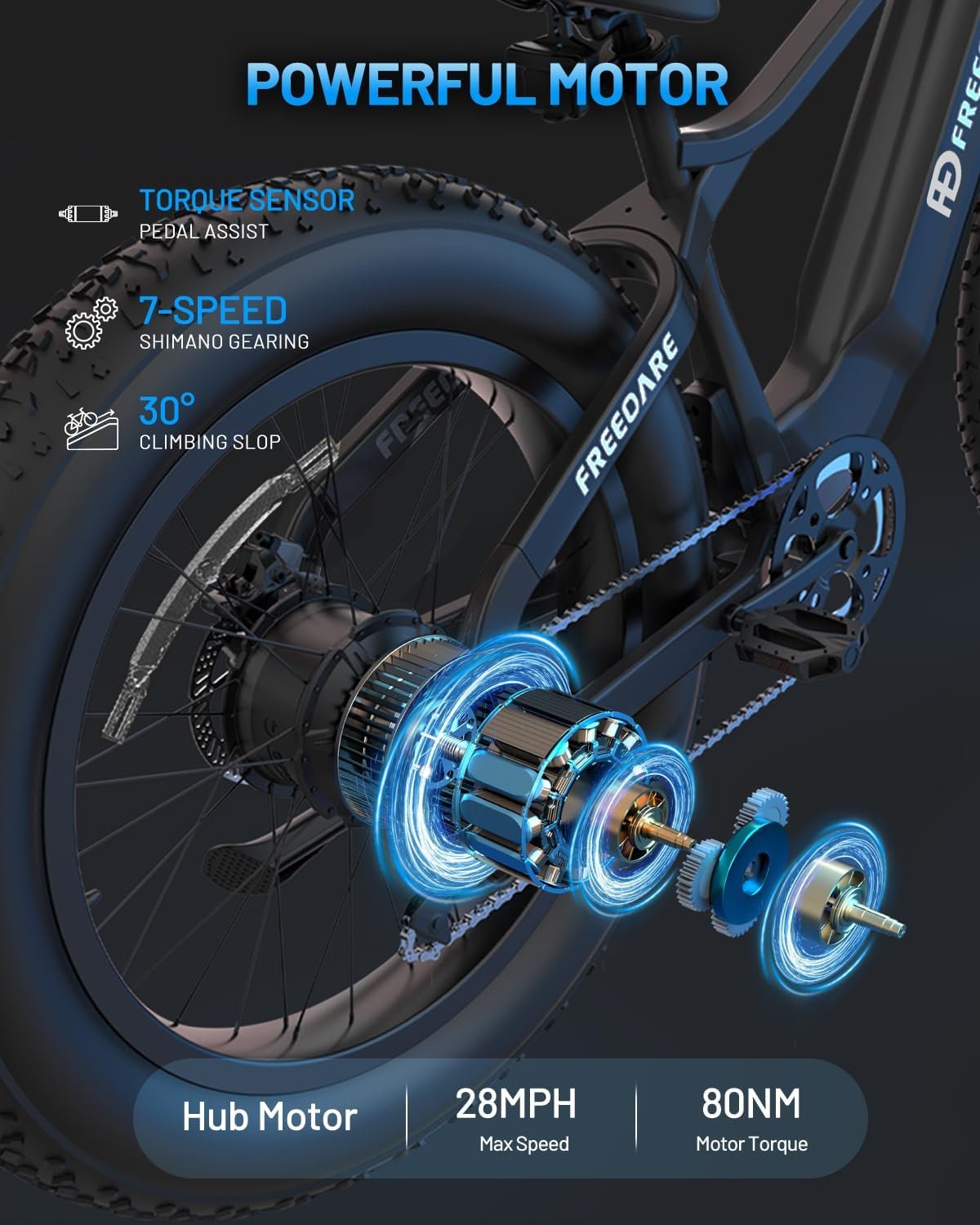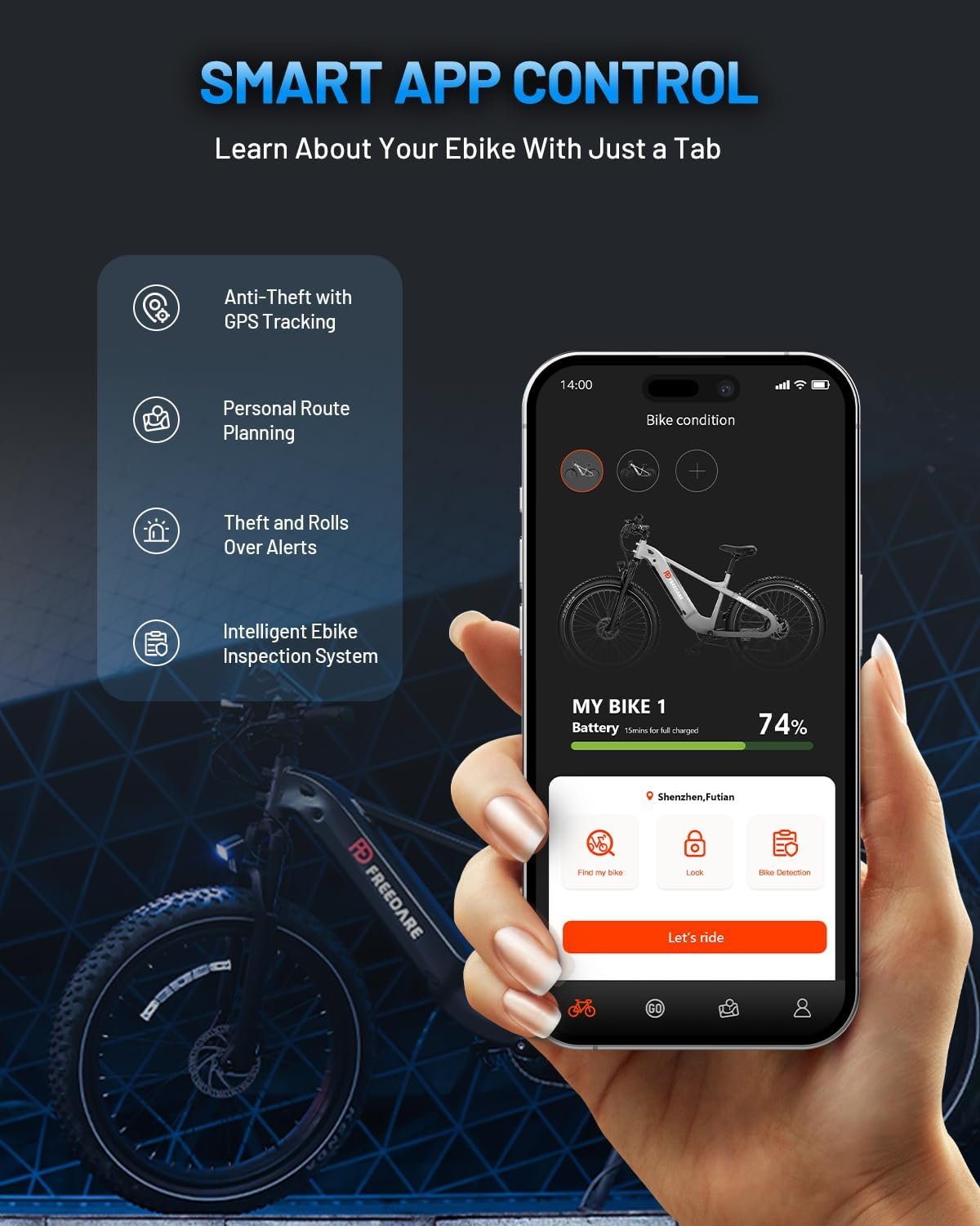 [Ride Smarter and Safer]FREEDARE smart e bike comes with Bluetooth,4G and GPS,which can realize APP self-detection,anti-theft positioning functions and ride customization via riding modes.