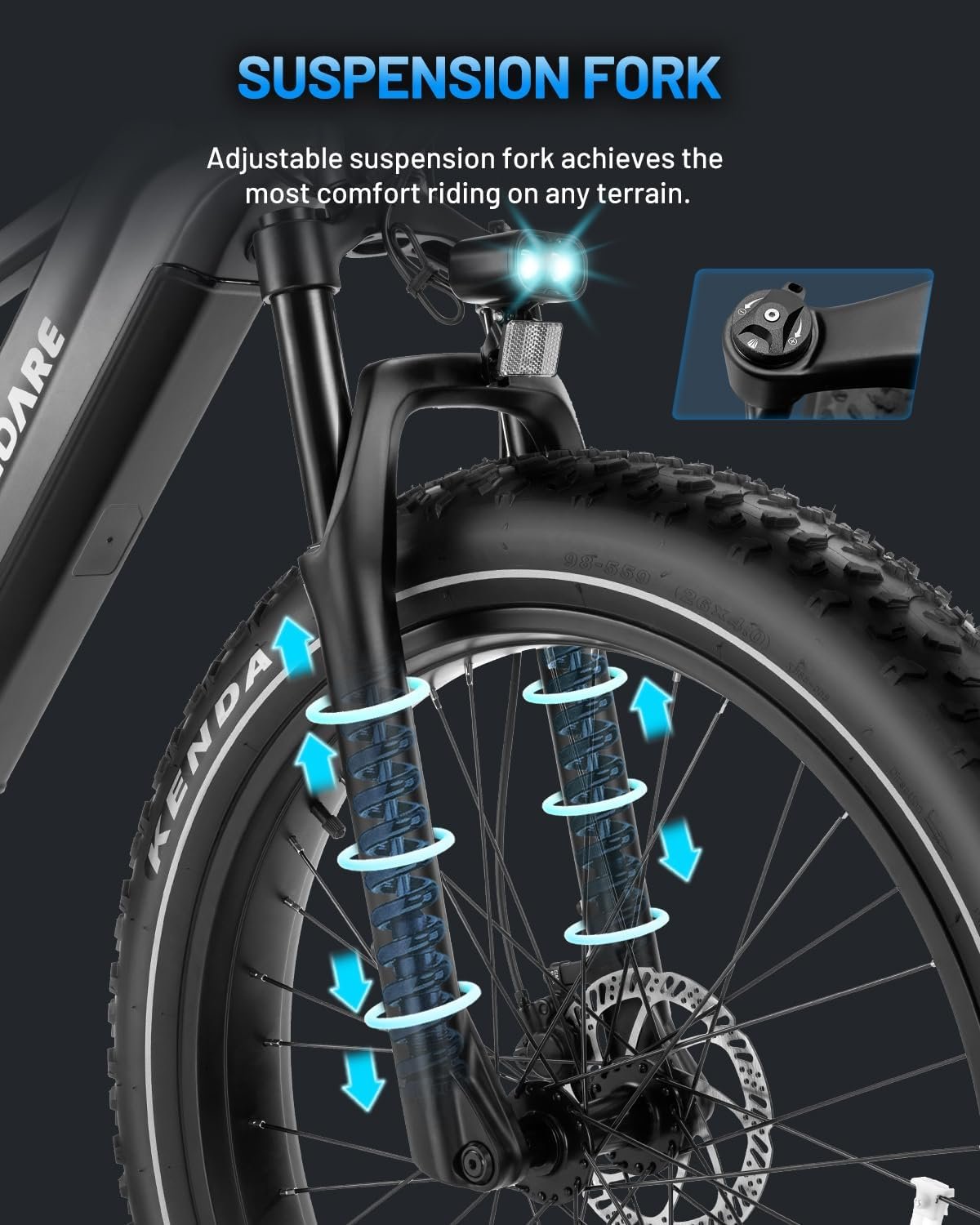 [Carefree Equipment]FREEDARE mountain ebike equipped with light-sensitive front light,IPX6 waterproof, and dual hydraulic-disc Brakes offering riders extra safety in any conditions.high-strength adjustable suspension front fork satisfy all kinds of challenge whether you are landing from stairs, crossing over rocky roads, or climbing up gravel slopes