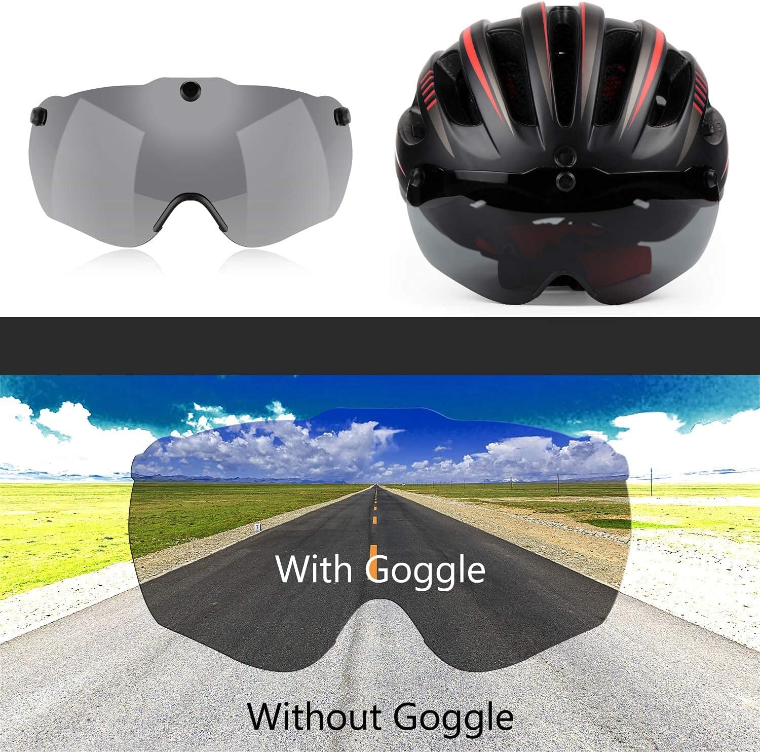 【Removable Magnetic Goggles UV Protective】Bicycle helmet with a unique magnetic goggles visor shield provides eye protection and blocks the sun and dust perfectly away from your face, UV 400. Your own glasses also can be worn under bike helmet goggles. A helmet meets your 3 wearing needs-goggles up, goggles down and no goggles. Your style bike helmet is designed by yourself.