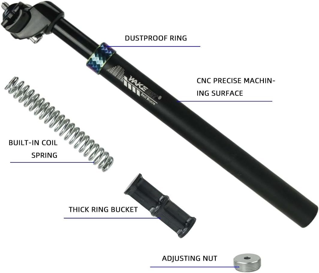 【Spring Coil Suspension】Build-in spring coil and damper rubber absorb the vibration while riding, the seat post comfort your riding experience, improve the shocks. Rebound force adjustable by tighten or loose the bottom screw. Suspension travel 45mm/ 1.77inch