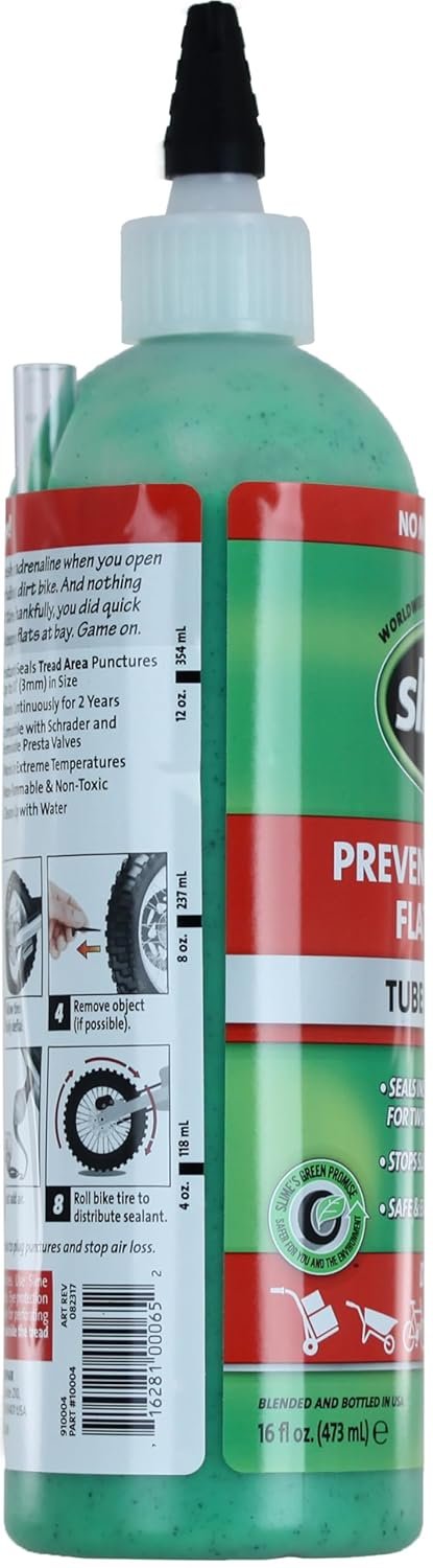 No more flats! Slime Tube Sealant seeks out and instantly seals punctures in your tubes up to 1/8″ (3mm). When a puncture occurs, our patented sealant is carried directly to the puncture. The pressure of the escaping air forces the particles into the opening, where they build up and intertwine to form a long-lasting, flexible plug. Instantly, air loss is blocked and a flat tire is prevented. Install in your bicycles, dirt bikes, wheelbarrows, riding mowers and more, and enjoy two years of continuous flat tire protection.