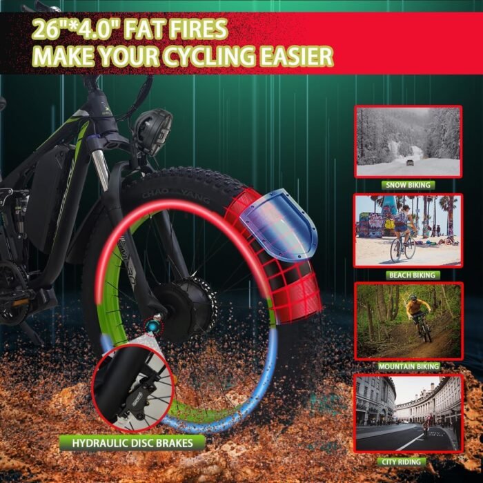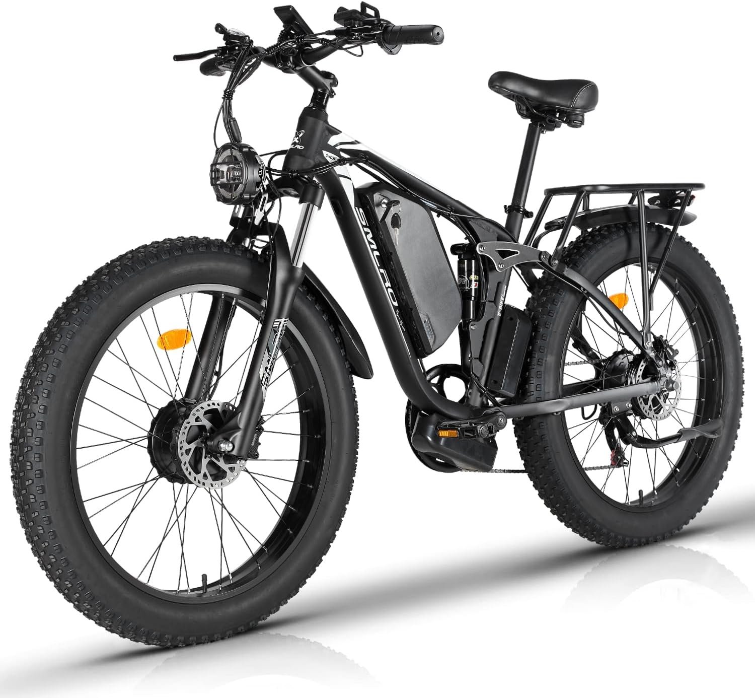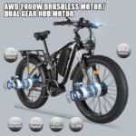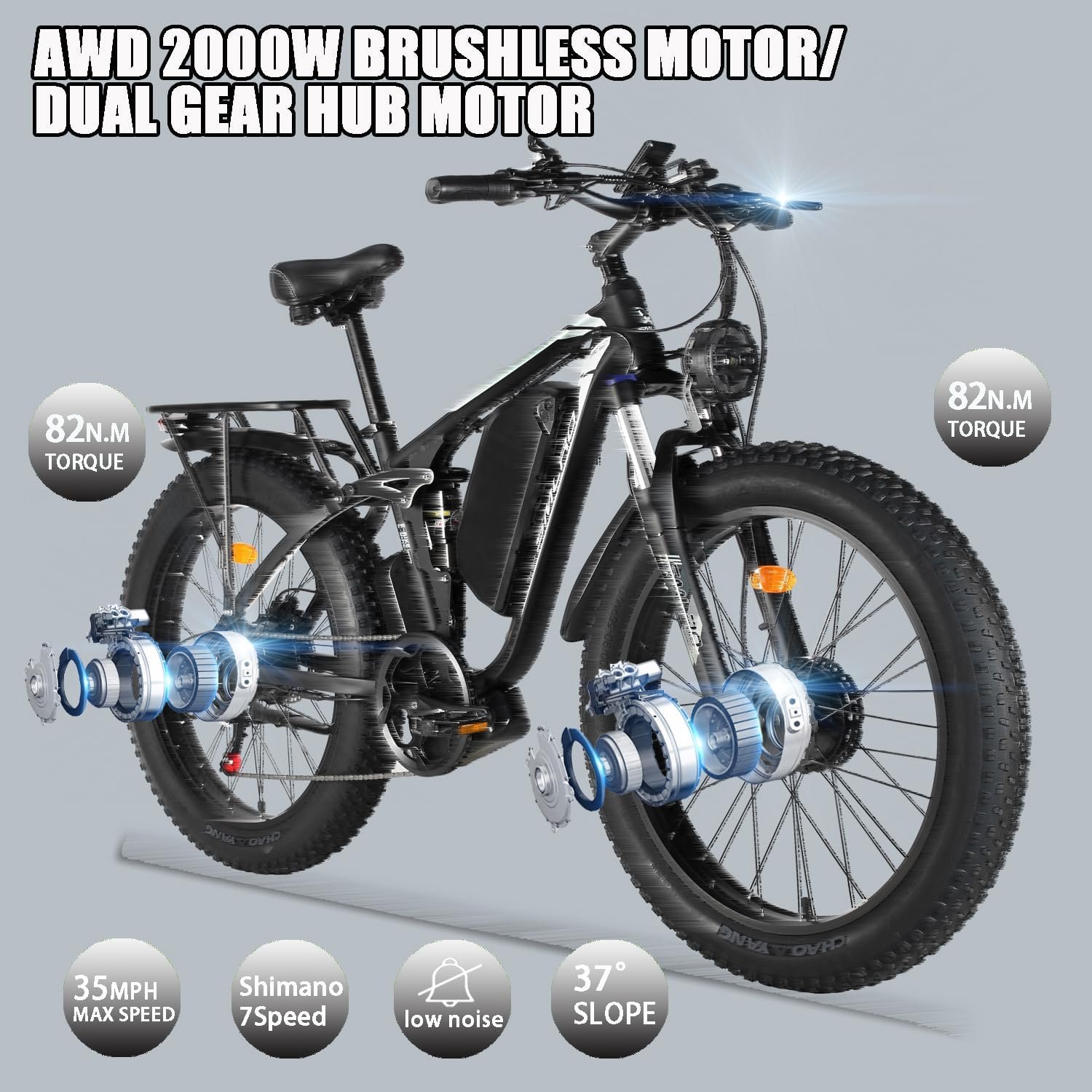 【Powerful Dual-Motor Electric Bike】: Effortless riding is ensured with a 48V 1000W brushless front motor and a 1000W rear motor, combining for a robust 2000W output. With Shimano 7-Speed Gear, In pure electric mode, these high-speed motors assist riding up to 35MPH (45 km/h), making it ideal for various terrains like snow, mountains, roads, and beaches. Crafted for easy assembly and exceptional quality.