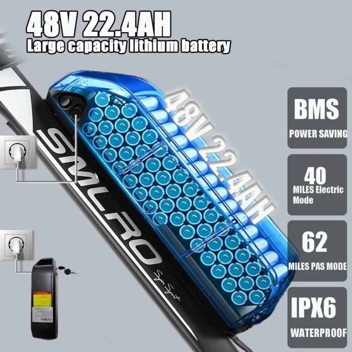 【High-Performance Lithium Battery】: Fitted with a 48V 22.4AH detachable lithium battery, offering nearly 1100kWh of capacity. The detachable, waterproof casing ensures convenient portability. equipped Battery lock allows you to install it while in use, avoiding the risk of theft. Charge directly on the bike or off, with a charging duration of approximately 4-6 hours and a lifespan of 2000 charging cycles.