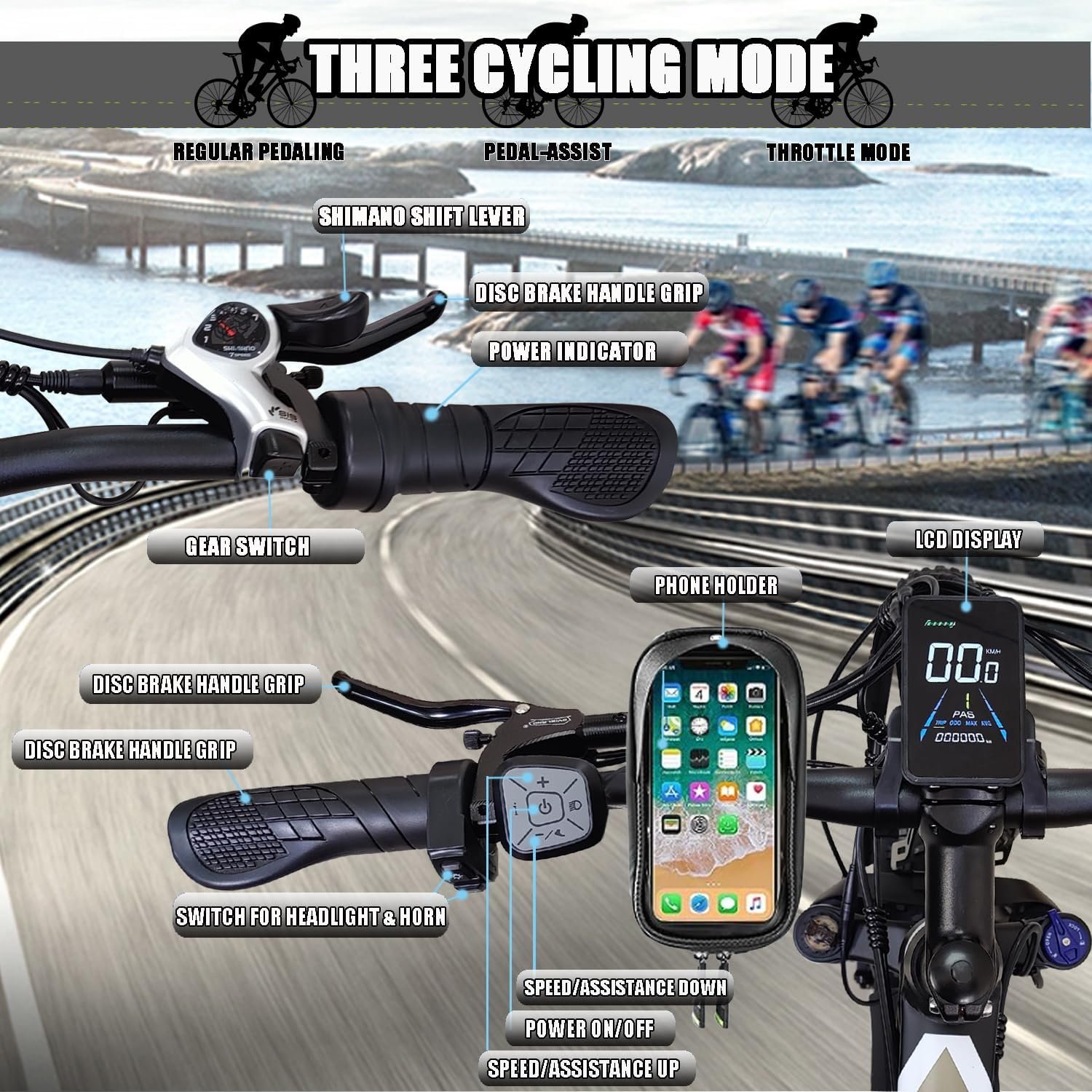 【3 Riding Modes】: Seamlessly switch between modes: Pure powered mode (no pedaling required) with a range of 30-40 miles (40-50 km). the pedal assist and electric hybrid mode can drive 37-56 miles. Pedal-only mode with seven gears for versatile terrain handling