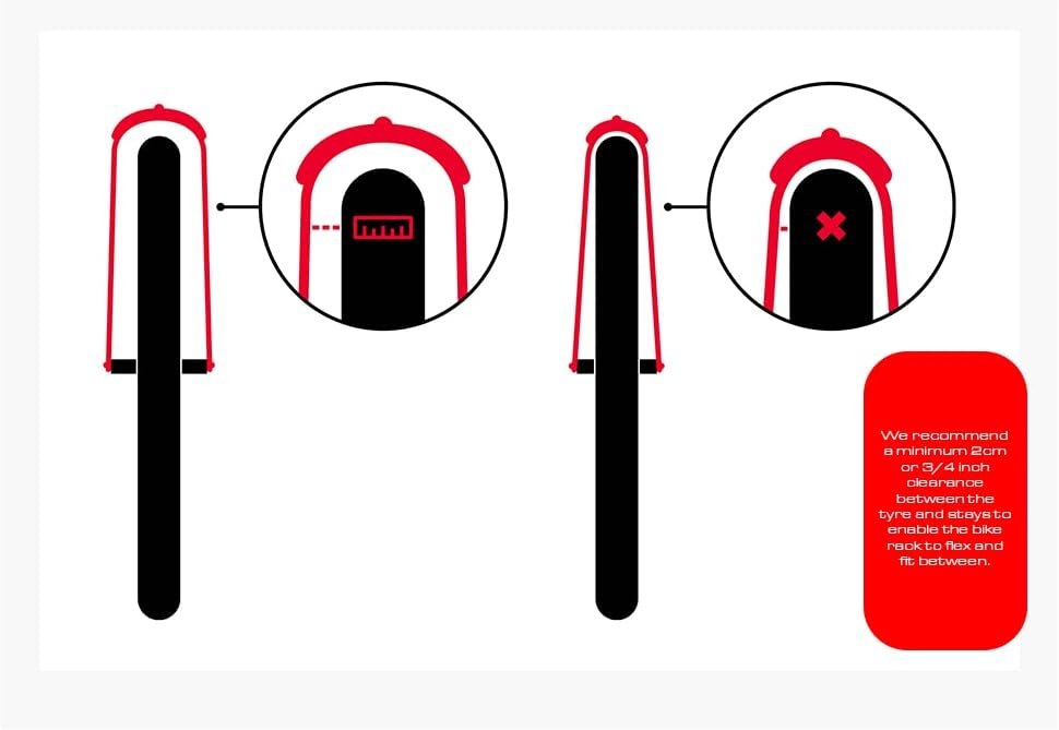 Specs: 2.1″ – 2.8″ Maximum Tyre Width 20″ – 29″ Recommended Wheel Diameter (including tyre). We recommend a minimum 2cm or 3/4 inch clearance between the tyre and stays to enable the bike rack to flex and fit between.