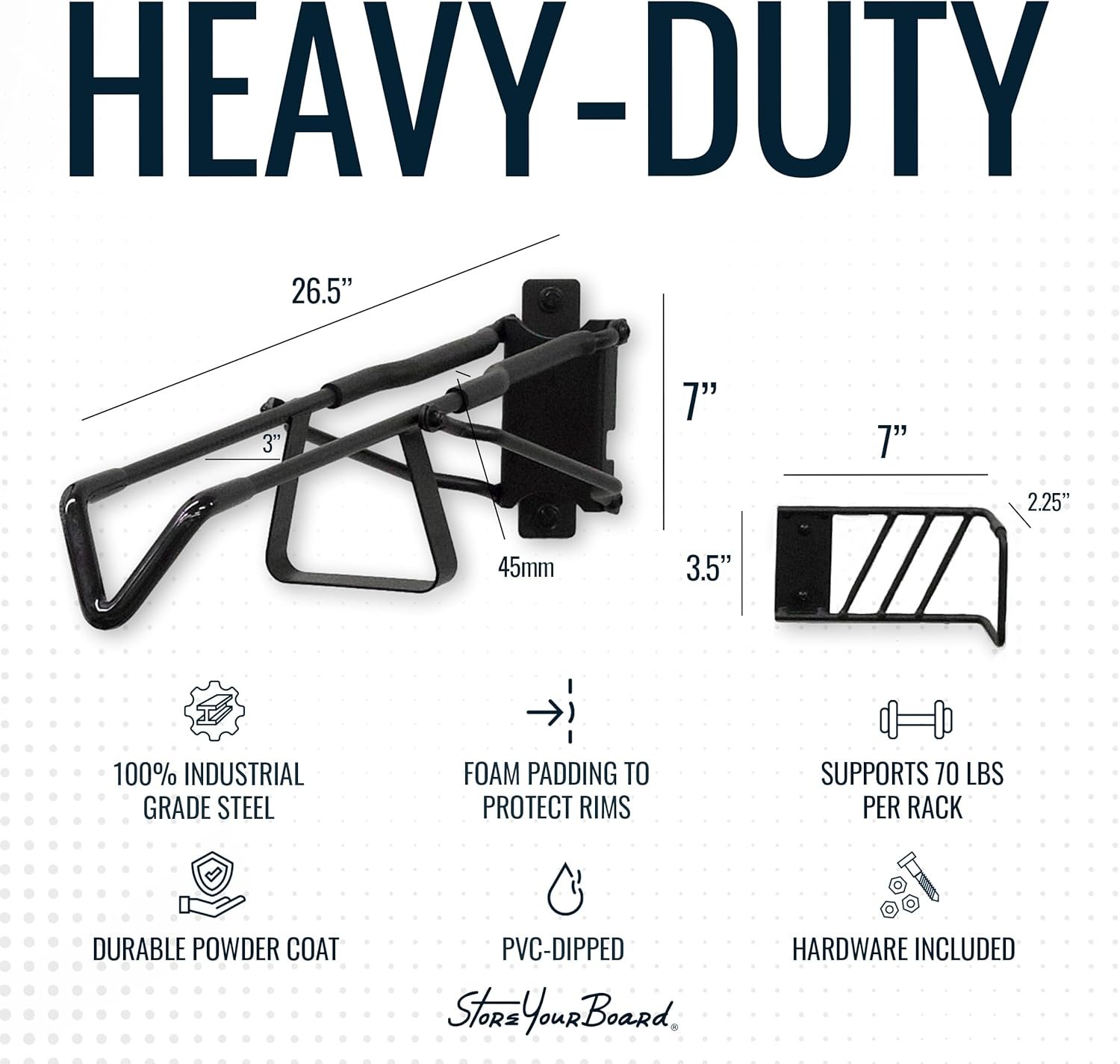 Heavy-Duty: Made from solid, industrial-grade steel for durable bike organization. No plastic parts. It supports up to 70 lbs, making it robust enough to store your most valuable bikes, including road bikes, gravel bikes, and e-bikes.
