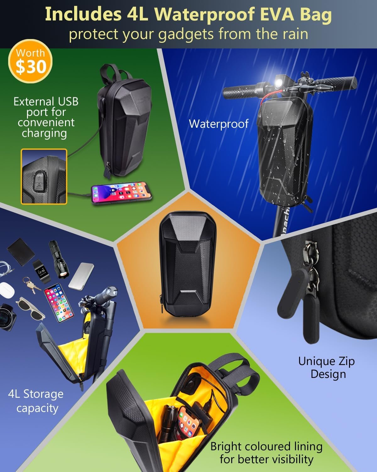 【Practical Design】Capacity: 4L; Mesh pocket internal classified storage design. Bright colored lining for better visibility. The storage bag features reflective strips on the front to improve visibility in low-light conditions. Be seen by other drivers and pedestrians, ensuring a safer riding experience.