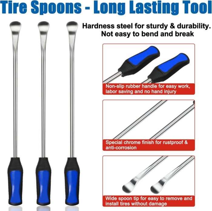 Professional Craftsmanship — Tire pry bar set has a good length for strength, rubber grip handle great to hold. The spoons are shaped well with smooth rounded edges, easy to use and save your time.
