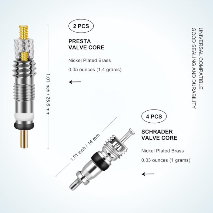 𝗩𝗲𝗿𝘀𝗮𝘁𝗶𝗹𝗲 𝗔𝗽𝗽𝗹𝗶𝗰𝗮𝘁𝗶𝗼𝗻𝘀: Designed for a wide range of standard valve core maintenance and replacements, our product is perfect for various vehicles, including cars, trucks, motorcycles, bicycles, electric cars, ATVs, lawn mowers, and even car air conditioning units. These universal valve cores are compatible with Presta, Schrader, Presta Extender, and Tube Tire Valve Tools (please note that not all valves are removable).