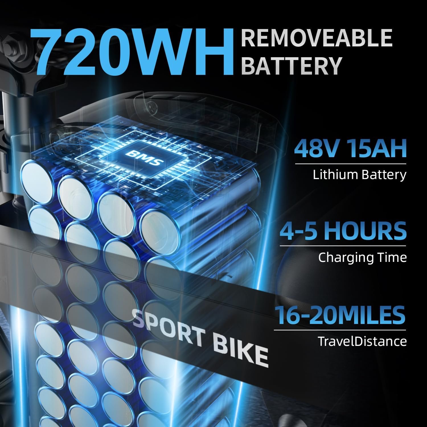 【Removable Larger Battery】The e bike comes with 48V 15AH larger battery which makes longer using lifetime. It also offers electric bike for adults long riding range, with 16 miles of pure electric cruising per full charge and 25 miles of assisted driving. Removable battery makes it easy to charge, 5-7 hours fully charged