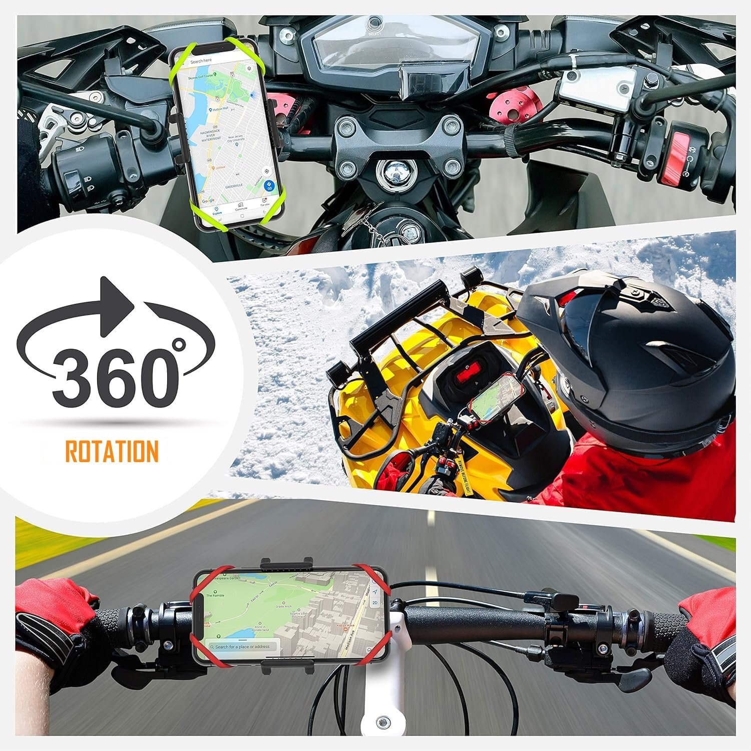 ✔️ UNMATCHED COMPATIBILITY – Our phone holder for bike is a universal-size accessory that can fit phones with a screen size of 4-7 inches and a thickness of up to 18mm. This phone mount ensures a tight, non-scratching fit on all handlebars, including dirt bikes, motorbikes, motorcycles, ATVs, electric scooters, ebikes or strollers, being compatible with 0.55-1.26 inches (15-32mm) diameter handlebars.