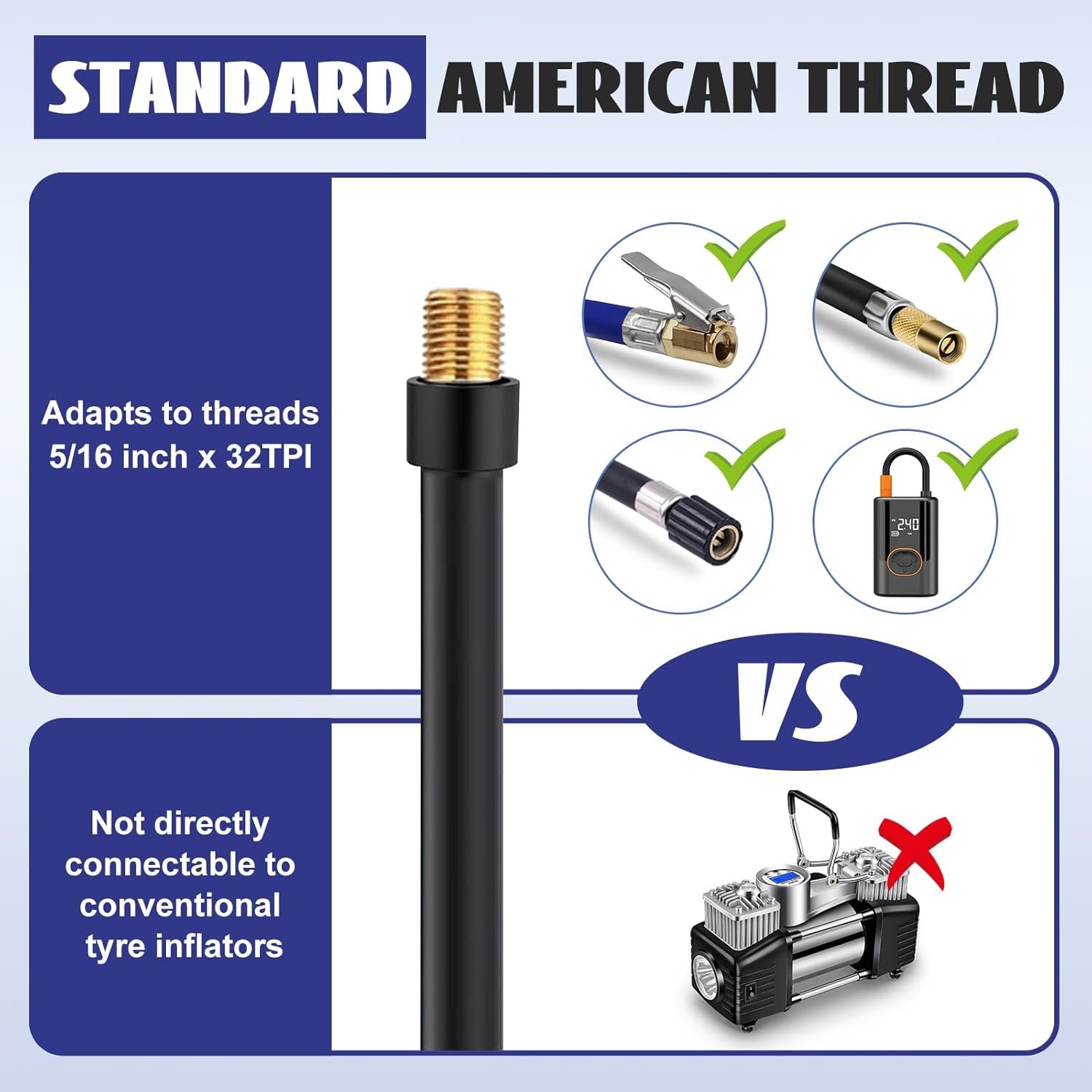 Professional design:The extension tube helps you to quickly connect the tire to the inflator, the screw-in inflation ensures that the tire does not leak and the pressure does not drop when the tire is deflated, so you can inflate the tire more quickly, safely and securely