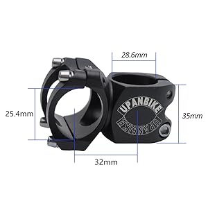 Bar Clamp Diameter(Suitable for Handlebar diameter):25.4 mmStem Clamp Diameter:28.6mm(1-1/8″)Length:32mm (center distance of the two holes) Features
