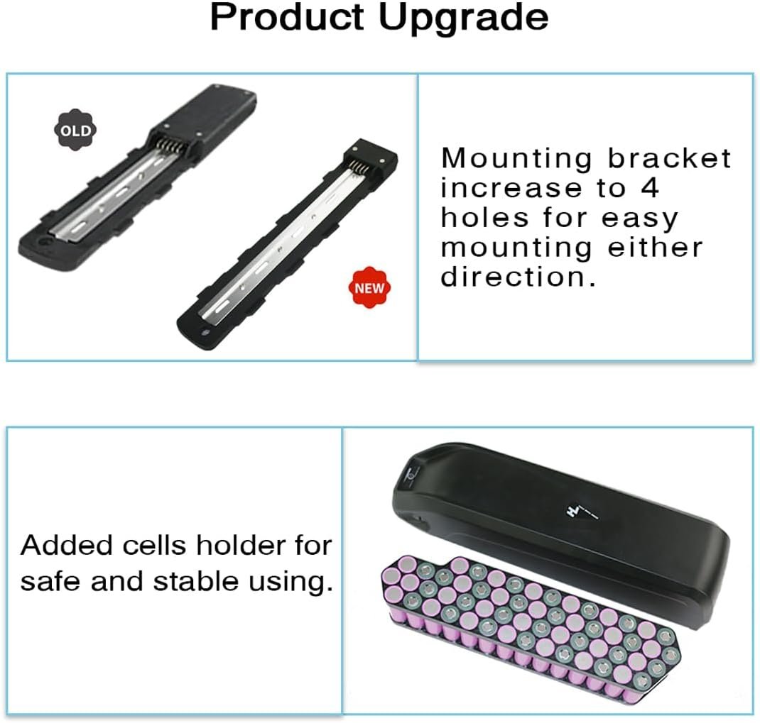🚵♀️🚵♀️🚵♀️【Key Features】The electric bike battery with battery base that will fit for most bike frame. //Lock with keys securely locks the mount on bike frame, prevents the battery from being stolen.// Lighted battery LED power Indicator, inform you charge your battery on time.// Each pack have ran through a full charge and discharge test in produce, make sure you getting every amp hour you paid for.