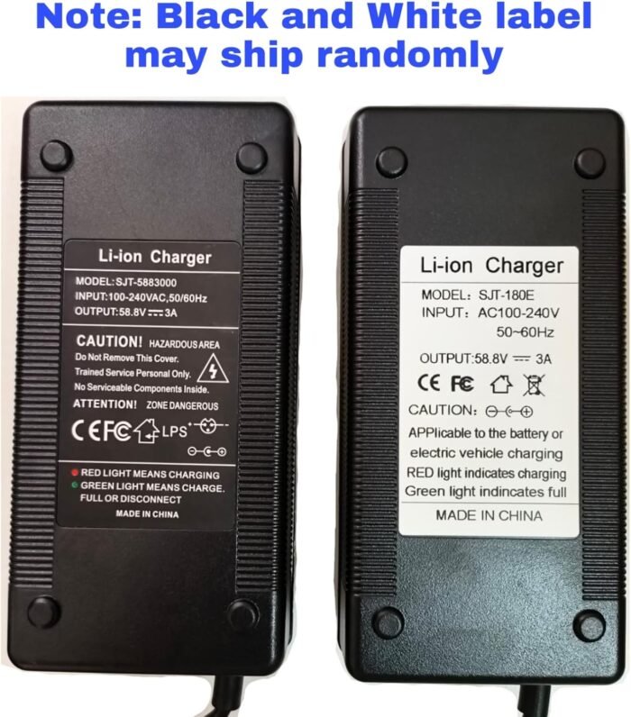 Specification: 52V eBikes Lithium Battery 3-Pin Charger/ Input: 110V-240V AC ~50/60Hz, 2A / Output: 58.8V, 3A Max, Works with 2A, 1.8A / 7.5 ft Long Cord