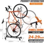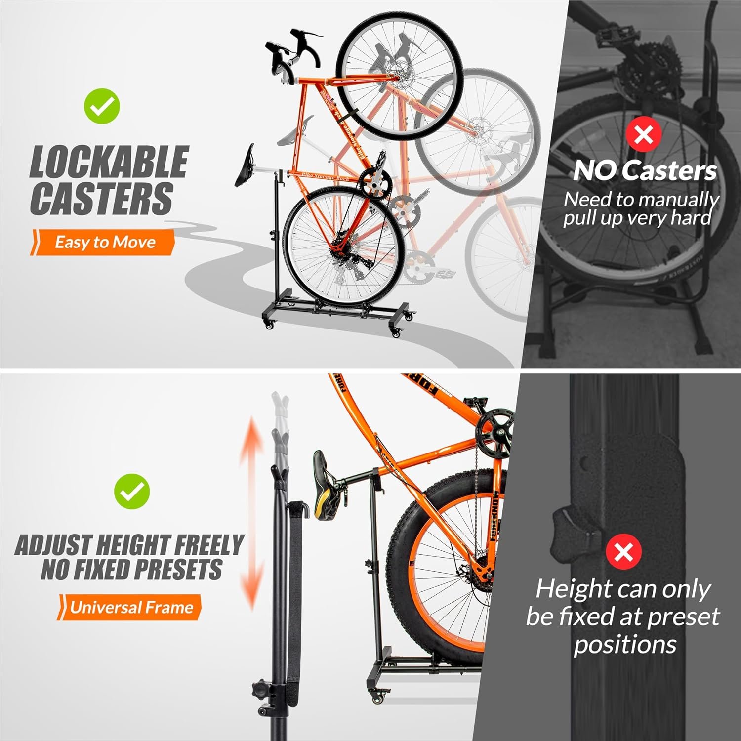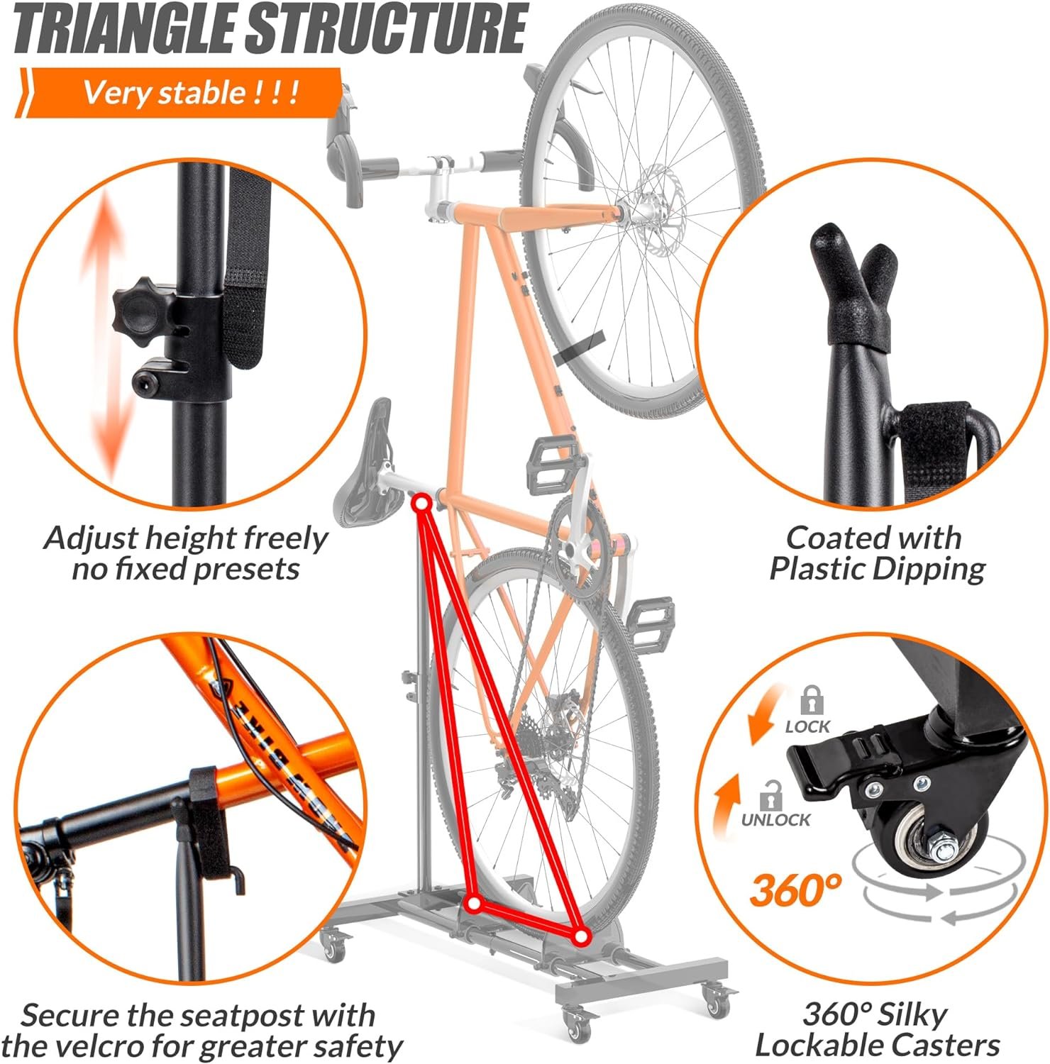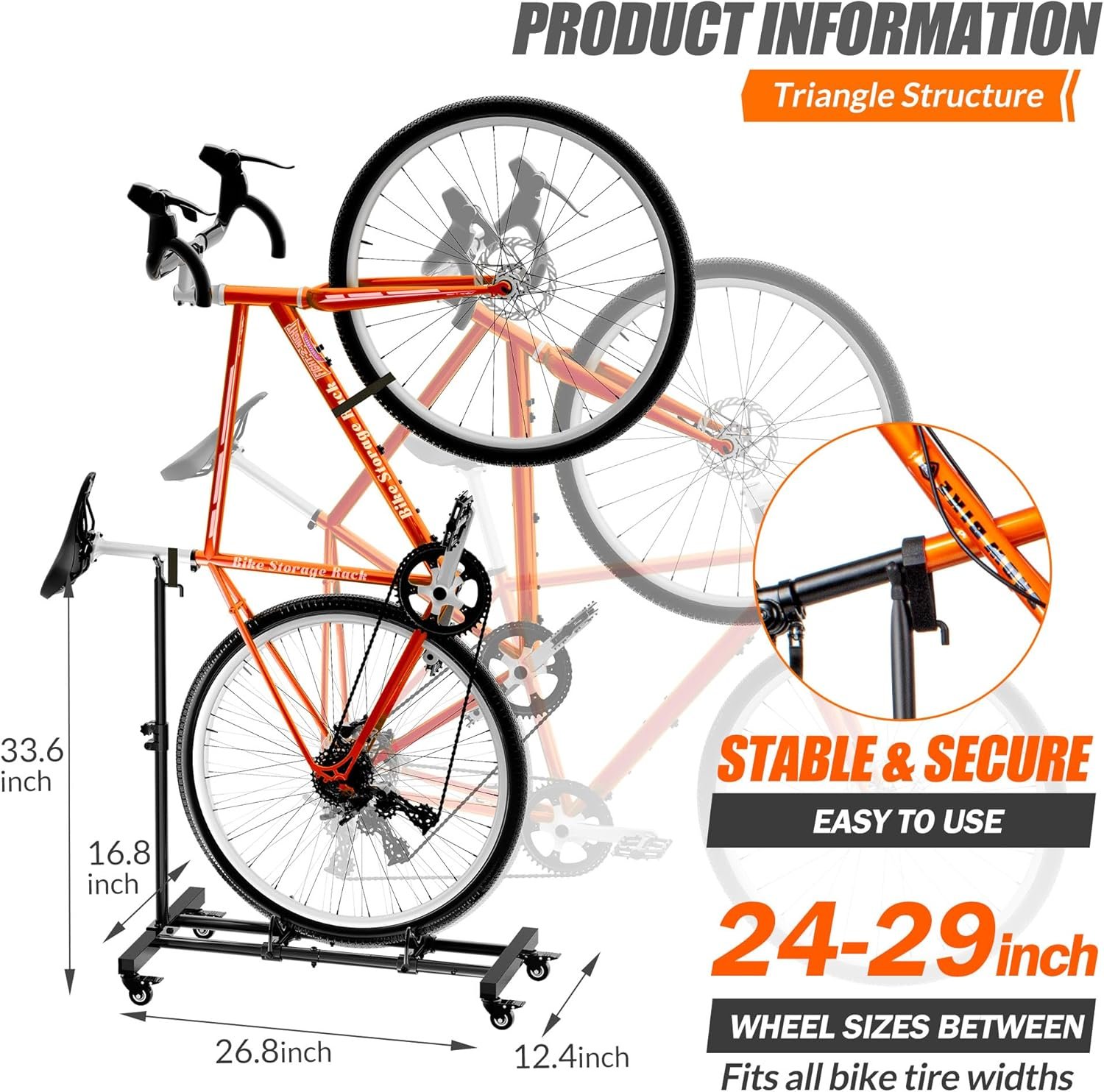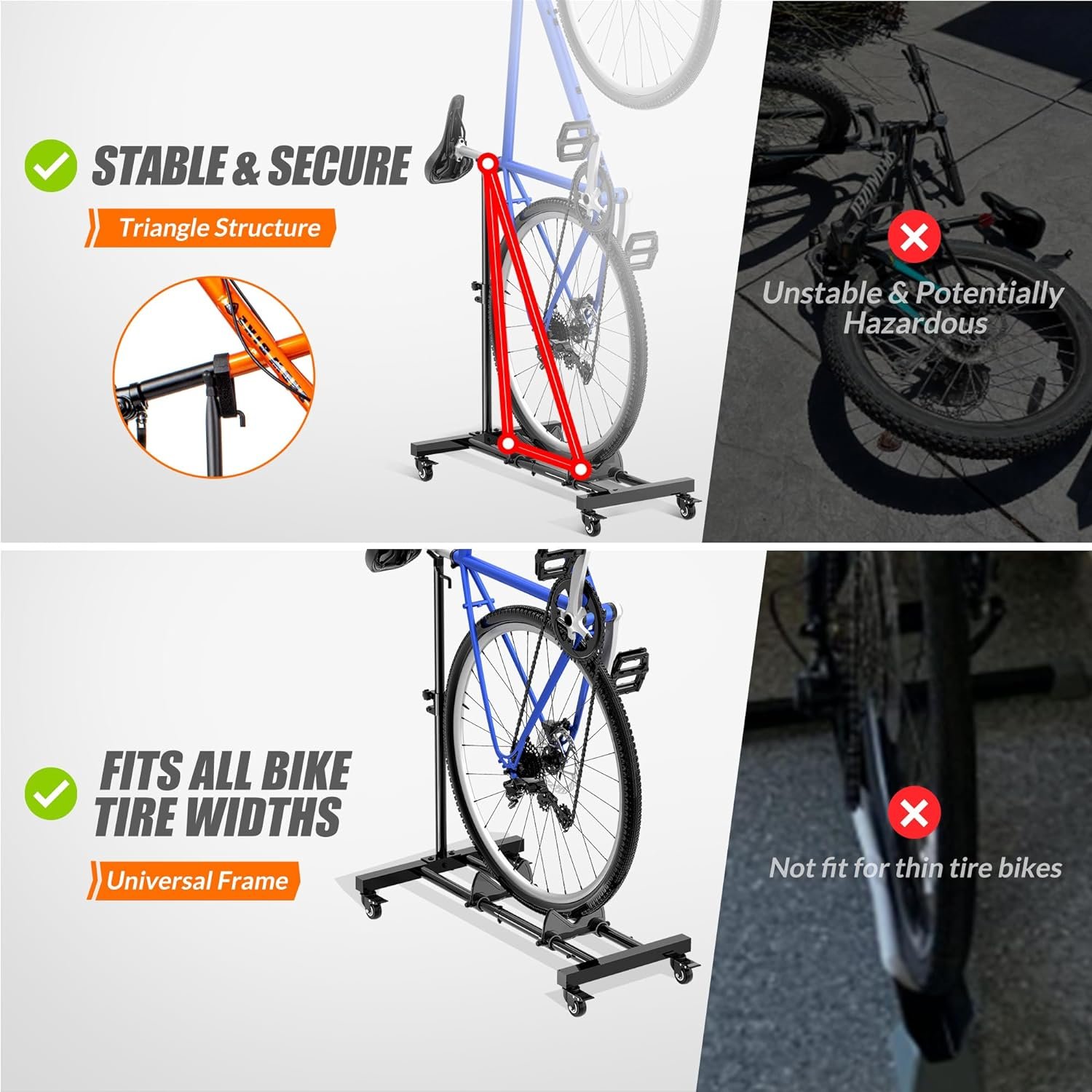 Add Lockable Rolling Wheels Design: With four 360 degrees rolling wheels, the vertical bike stand can be easily move to wherever indoors or outdoors. The casters can be locked to prevent sliding. The casters are designed to share the weight of the vertical bike stand, which can reduce our rack when moving the stand. The casters can bring better stability to ensure the bike stand will not accidentally fall down when parked, protecting the safety and integrity of the bike.