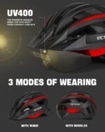 Magnetic Helmet Goggles and Visor: This VICTGOAL bike helmet with visor and goggles, it is an ideal bike helmet for mountain bike and road bike cycling. You can put the goggles and visor together, not only can protect your eyes from sunlight, but also can protect your face against the sand and wind. It also won’t interfere with wearing your own glasses.