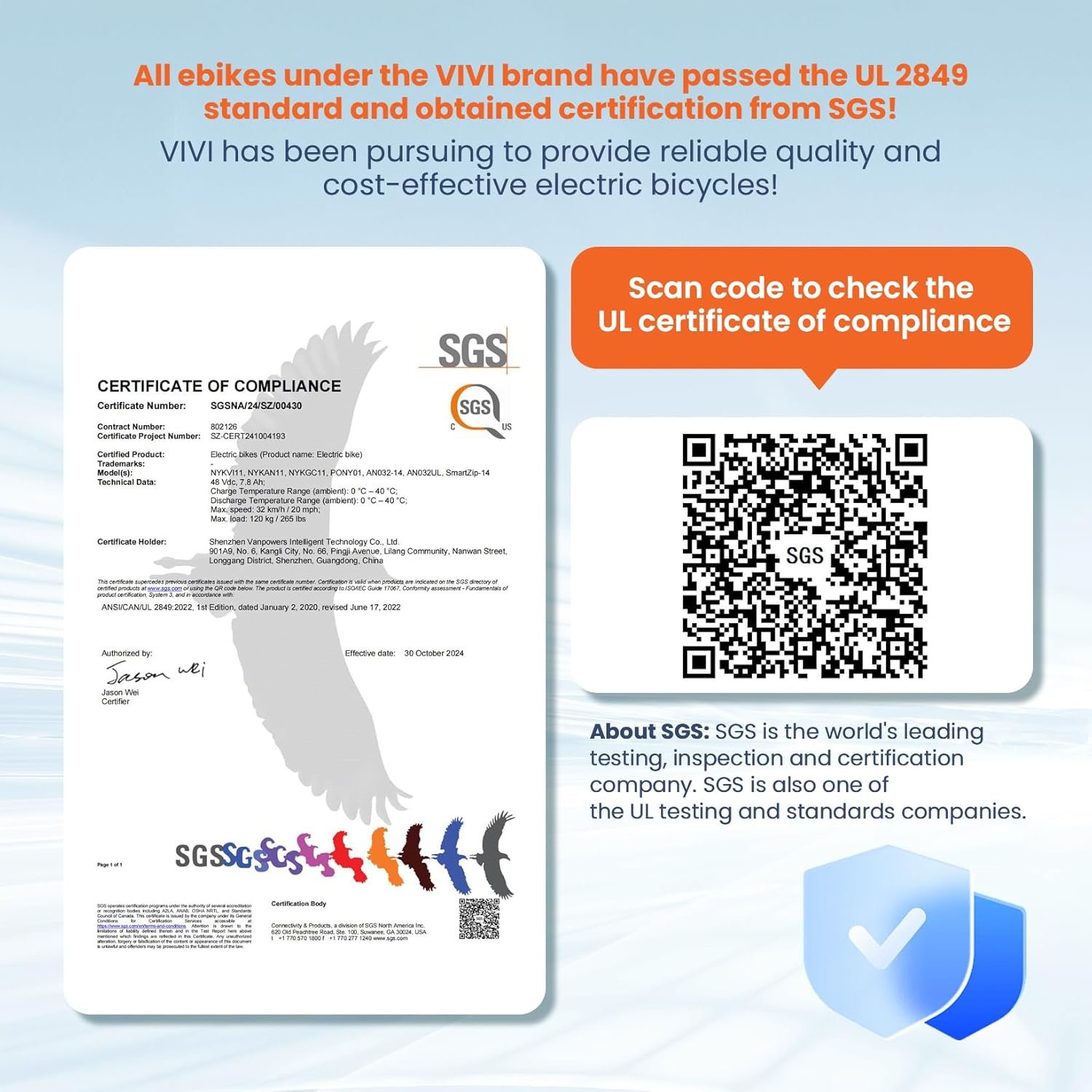 Certified Safety and Quality: Vivi PONY01 is UL 2849 and UL 2271 certified (Certificate Number. SGSNA/24/SZ/00430), (UL 2271 Certificate Number. SGSNA/24/SZ/00444U).【Buying a UL certified e-bike is a smart choice for safety and quality assurance.】