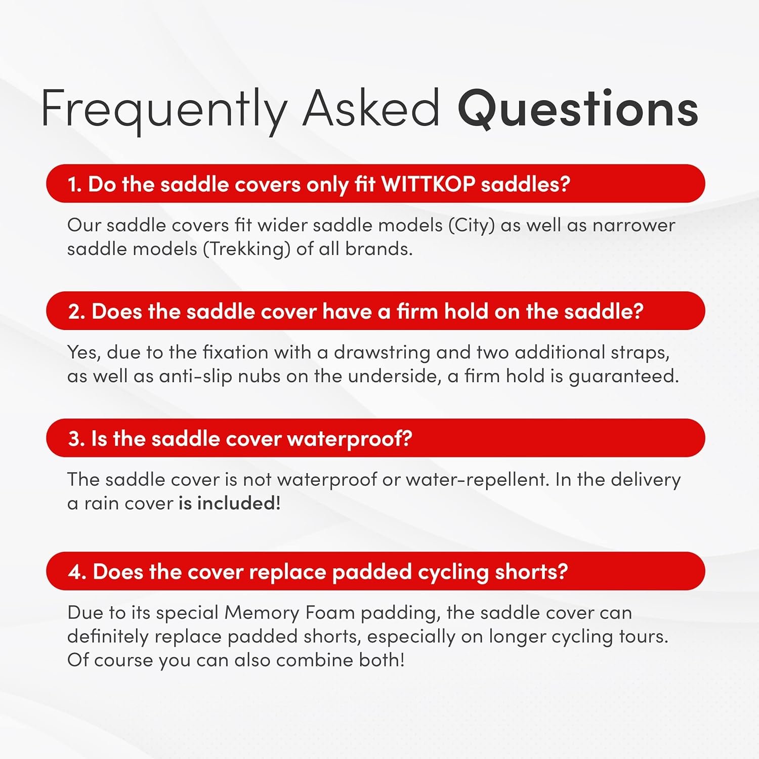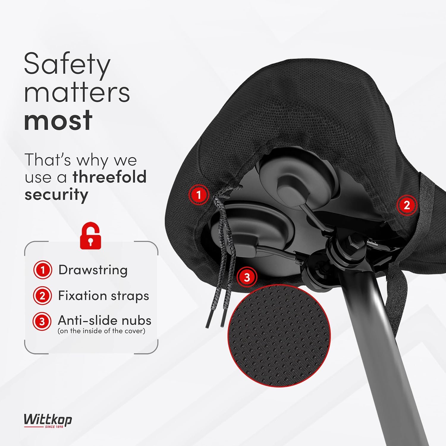ANTI-SLIDE PAD – Say goodbye to slipping on your bike seat thanks to your Wittkop seat pad. The specially designed anti-slide nubs on the underside of the saddle cover as well as straps for better fastening prevent any slipping.