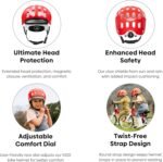 ADVANCED HEAD PROTECTION: Outer shell construction is fused directly to the inner layer (in-mold design) saving weight while maintaining long-lasting stability; the second in-mold layer on the lower edge increases the helmet’s hard-wearing durability. Our innovative visor, crafted from a non-toxic elastomer with a honeycomb structure, not only shields from sun and rain but also enhances impact cushioning to safeguard your child during falls.