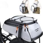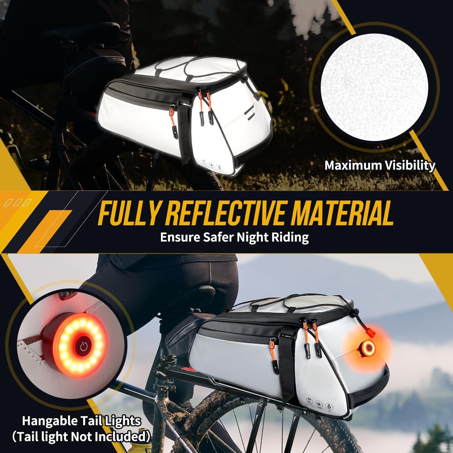 Full Reflective Design — The silver bicycle rear rack bag features an all-around fully reflective fabric, ensuring safety both day and night. It can be additionally equipped with a bicycle tail light for dual protection, enhancing visibility during nighttime rides for a safer cycling experience