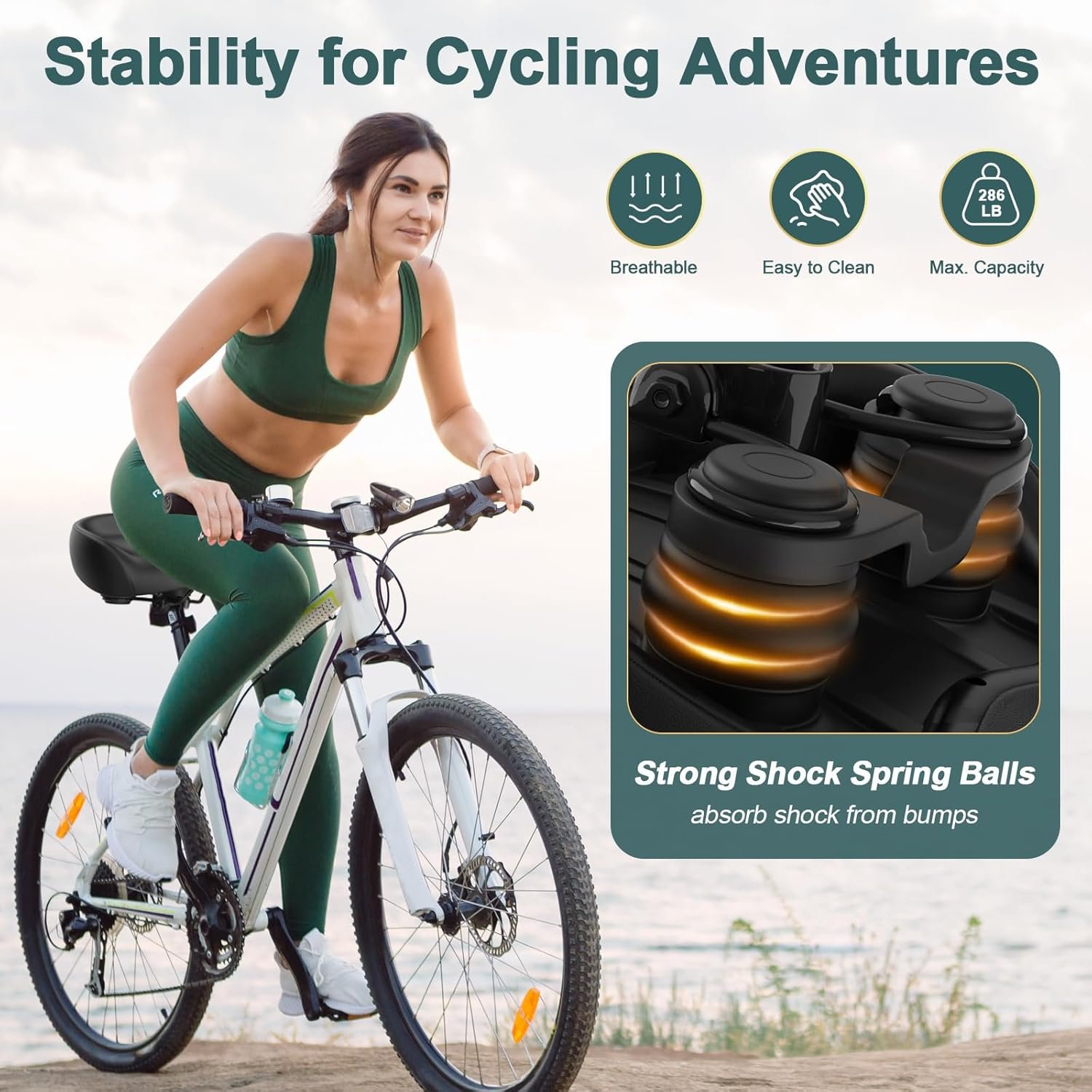 Stability on Cycling Adventures – A bigger seat adds more comfort and stability, with the two strong shock spring balls on the bottom ensure absorbing the shocks coming from the bumps, potholes or any difficult terrain you are riding on. If you like mountain bikes, but take a more leisurely ride this is the perfect choice.