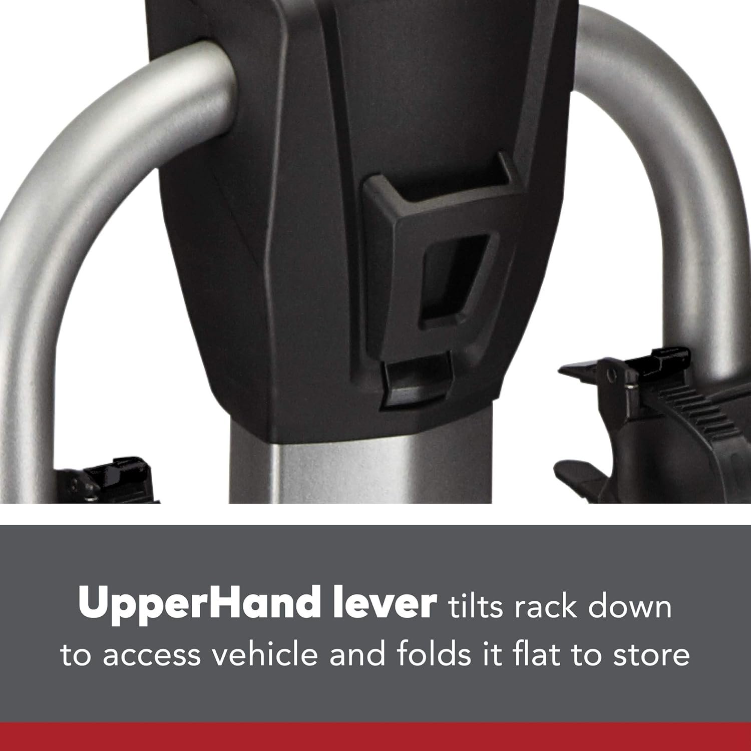 Back Rack Easy Tilt Design: Features an UpperHand Lever that simply tilts the rack for easy vehicle access and folds flat for compact storage; Securely fasten your bikes to the rack using ZipStrips