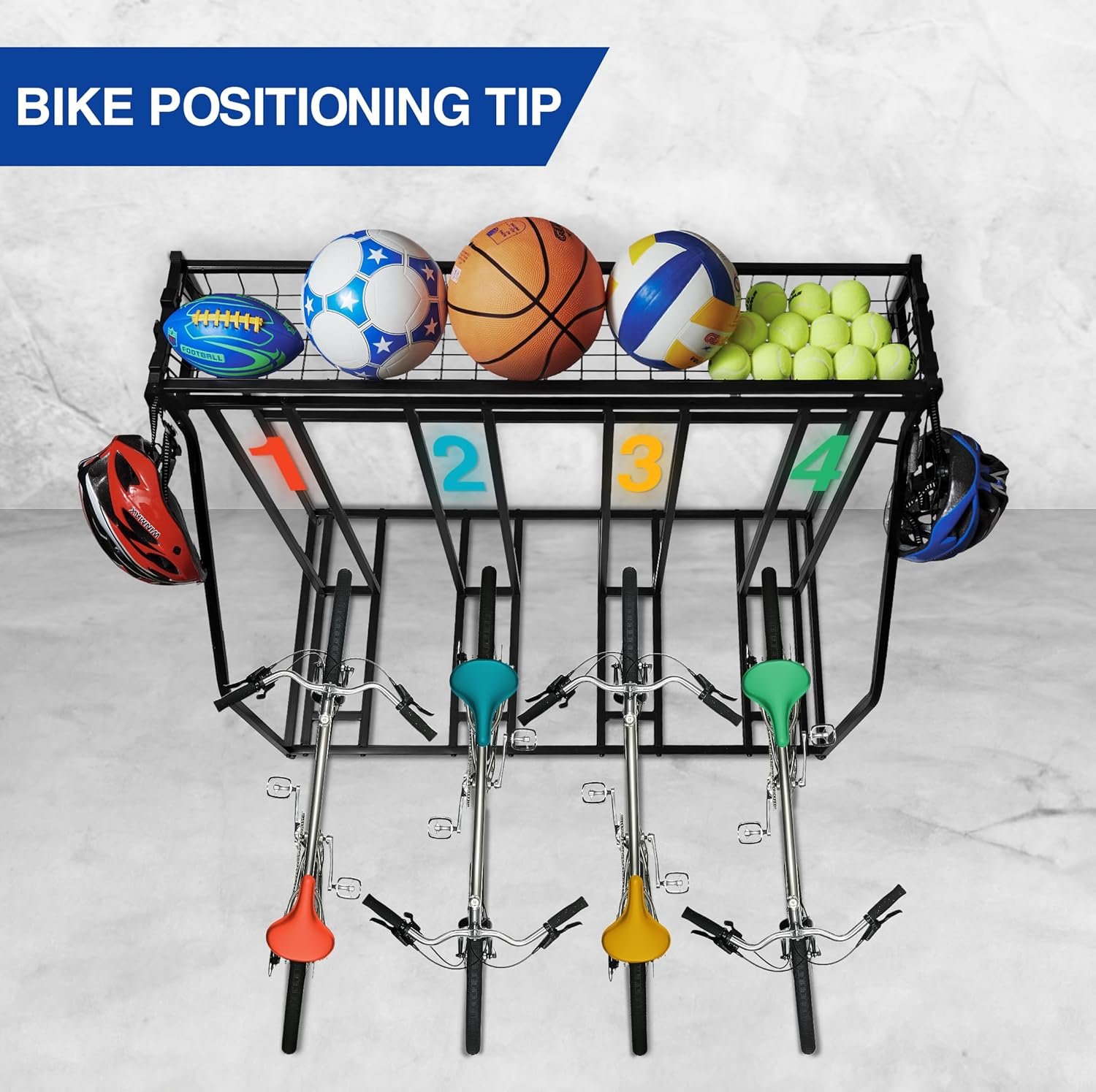 LARGE STORAGE BASKET: Bike stand for garage keeps biking gear organized and easily accessible, large basket where you store helmets, gloves, bike accessories; Garage bike stand comes with 4 hooks so you can have storage on the side as well