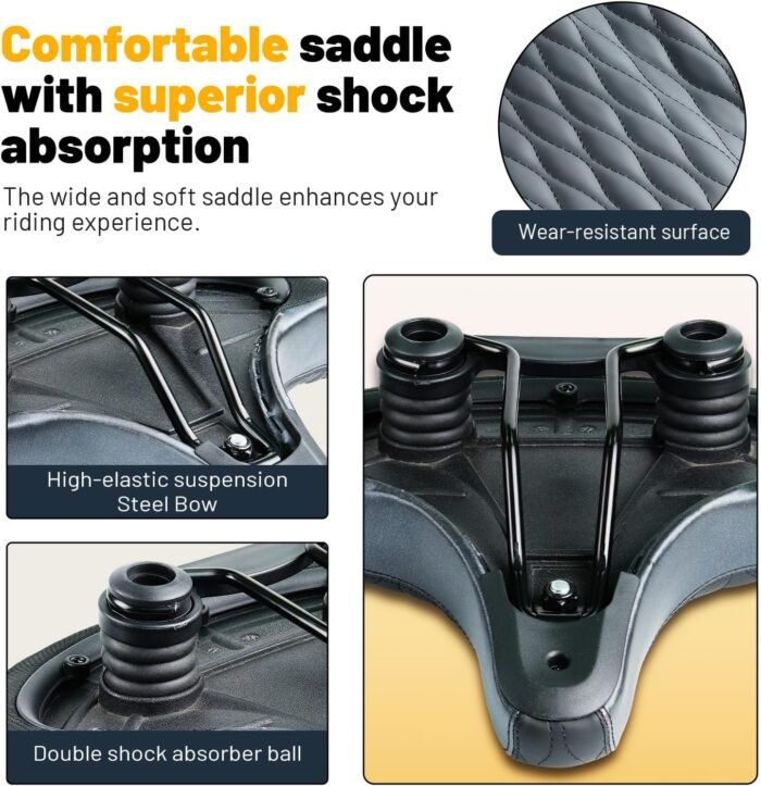 Shock Absorption System – Equipped with elastomer spring suspension, the bike seat absorbs shocks and vibrations from bumps and rough roads, providing a smooth and stable ride for all types of terrain