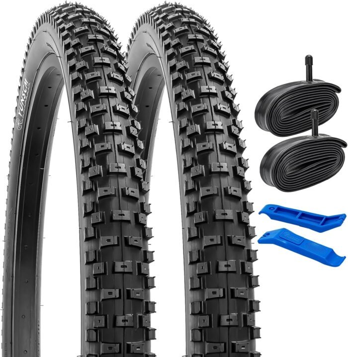 Package Includes: 2 pcs 26″x2.35” bike tires, 2 pcs 26″x2.10/2.40 AV32mm Schrader Valve heavy duty bike tubes