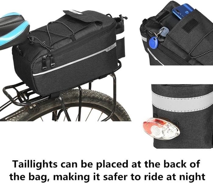 Safety Design: There are several reflective strips on the rear bike rack bag for increasing visibility and safety at night. Taillights (Not Included) can be installed at the back of the bag, which greatly improves the safety of riding.