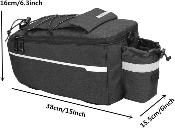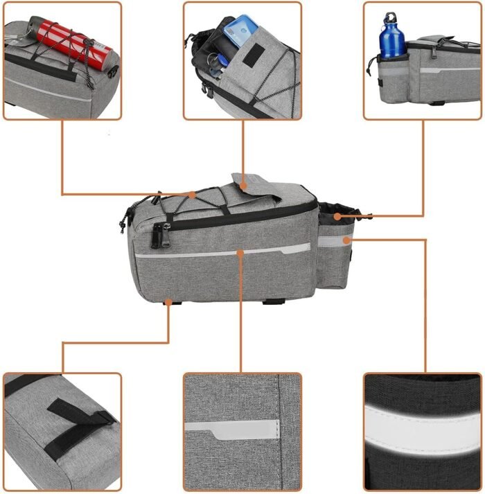 10L Large Capacity: This bicycle rear rack carrier bag features a main compartment, a top pocket and a water bottle pocket, which can help you store the essentials on the road well.
